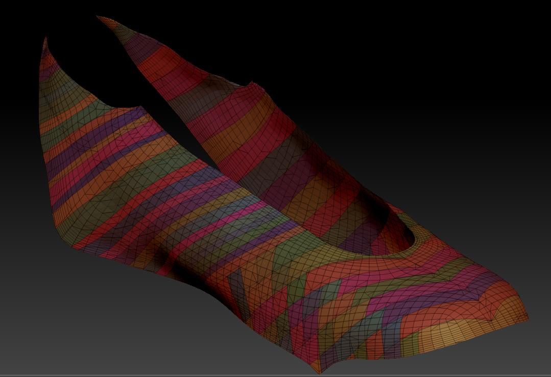 Below: The modeling process. I cut up the shoe and partition it into polygroups so I can get really crisp lines while modeling. The process is extremely quick and doesn't require any freehand sculpting. I mostly use the splice tool to create the groups.